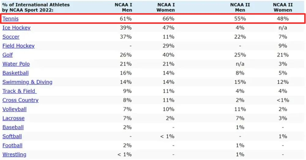以美国为例,其大学教育体系极度重视体育特长。根据NCAA 2022年公布的数据,网球是国际生运动员在美国大学校队中占比最高的项目,哈佛、耶鲁、普林斯顿等常春藤名校都拥有自己的网球校队。换句话说,网球,是通往世界名校的敲门砖之一。一名优秀的青少年网球选手,无疑是申请简历上的亮眼一笔,更有机会获得丰厚的体育奖学金,实现体育留学之路。