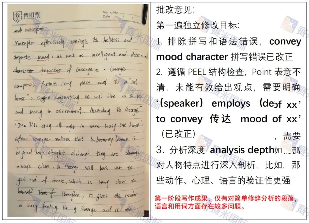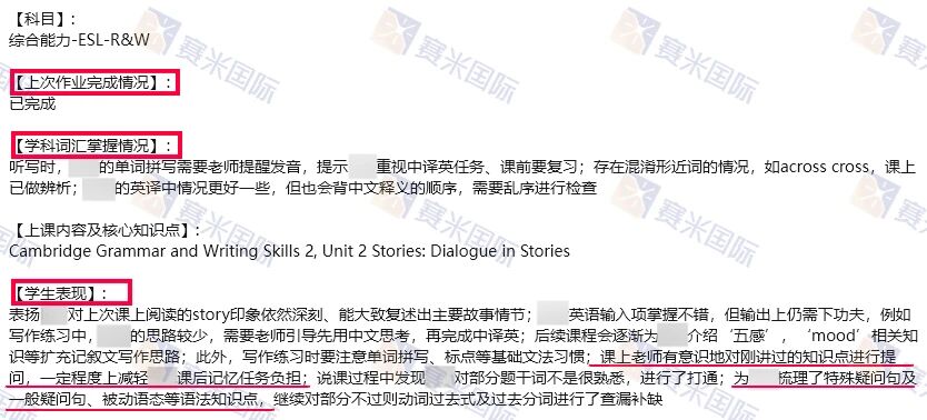 以前在写作时总是觉得思路不够多,老师会让我先用中文整理思路,再中译英,这样写作更顺畅。课堂上也学了五感和mood相关词汇,让我写记叙文时可以描述得更生动。平时上课时老师还会对刚学的知识点进行提问,让我不至于课后马上就忘记重点内容。写作中我也在注意单词拼写、标点,以及特殊疑问句、被动语态等语法知识。虽然挑战不少,但我感觉自己的英语输出能力真的在一点点提升。——武汉爱莎G5 B同学