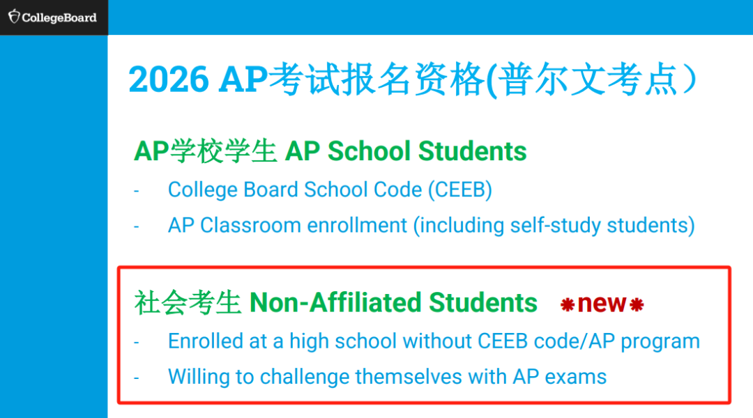自2026年起,Prometric管理的国内AP考试在继续面向AP授权学校考生提供服务的同时,将增设社会考生报名通道。欢迎目前所在学校未开设AP课程,但有意挑战自我、参加AP考试的学生积极报考。相关报名方式及操作指南将于10月上旬公布。
