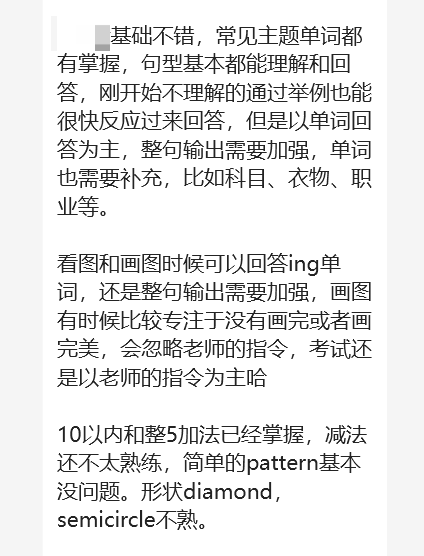 我没有急于让她补短板,而是先在反馈里记下每个细节:孩子画图时会专注于“画完美”而忽略指令,需要在旁提醒Z同学“先听老师说,再慢慢画”,保护她专注力的同时建立 指令优先级;孩子对单词的记忆很扎实,就决定从单词拼接入手,下次课试着引导她用说一些简单句子。那时我就知道,Z同学的潜力需要拆解式引导,把面试难点变成一个个可实现的小目标。