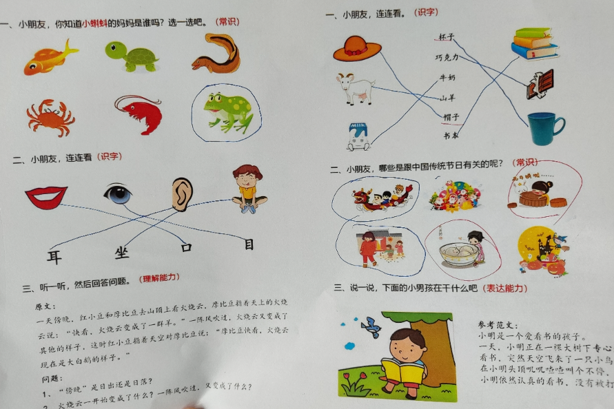 在中文表达能力方面,我们从最基础的汉字认读起步,逐步延伸到古诗背诵、看图说话和情境问答等多个维度。起初,Z同学在面对一些开放式问题时,常常不知道说什么。我们就一同从理解题目意图开始,逐步学习如何组织语言、如何运用合适的词语表达自己的想法。通过反复练习和情景模拟,Z同学能够流畅、有条理地阐述自己的想法,甚至能加入自己的观察和感受,语气也更自然大方。