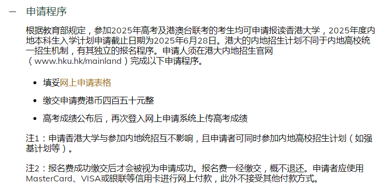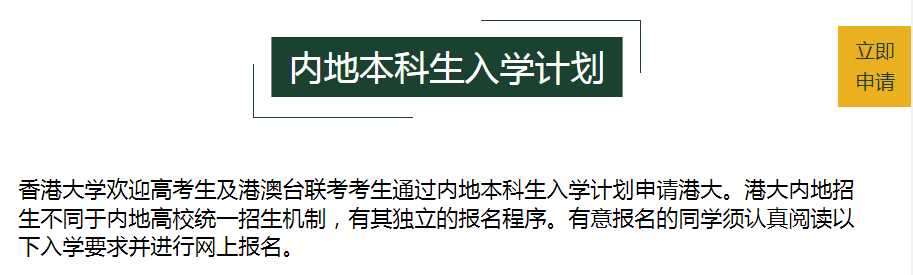 目前,港八大中,仅剩香港中文大学仍通过高考统招招收内地学生。内地考生通过填报高考志愿即可申请,录取主要依据高考成绩,通常不设面试。考生在填报高考志愿时,需在提前批次填报,港校依据高考成绩(不含加分)择优录取。另外,考生在填报港校志愿的同时,也可填报其它本科一批的内地高校,两者互不影响。