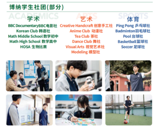 博纳拥有超过20个社团,涵盖了学术、体育、艺术等各类学生社团,助力学生在社团活动中发现自己的兴趣与热爱。通过春游、美食节变装日、趣味运动会、新年晚会等丰富多彩的校园活动,让所有同学都能体验到多姿多彩的校园生活。值得一提的是,所有的活动均由学生自主策划和组织,全面培养包括团队协作、沟通协调等在内的21世纪核心素养和能力。