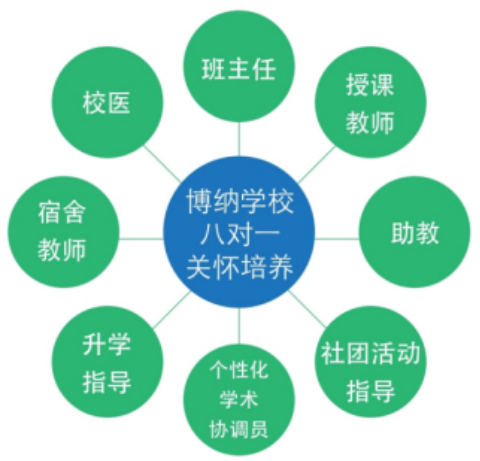 在个性化学生培养方面,博纳学校实行“八对一”的培养和关注模式,通过班主任、授课老师、助教、社团活动指导、学术支持、升学指导、宿舍老师等多方力量,实现对学生全方位的培养和关注。