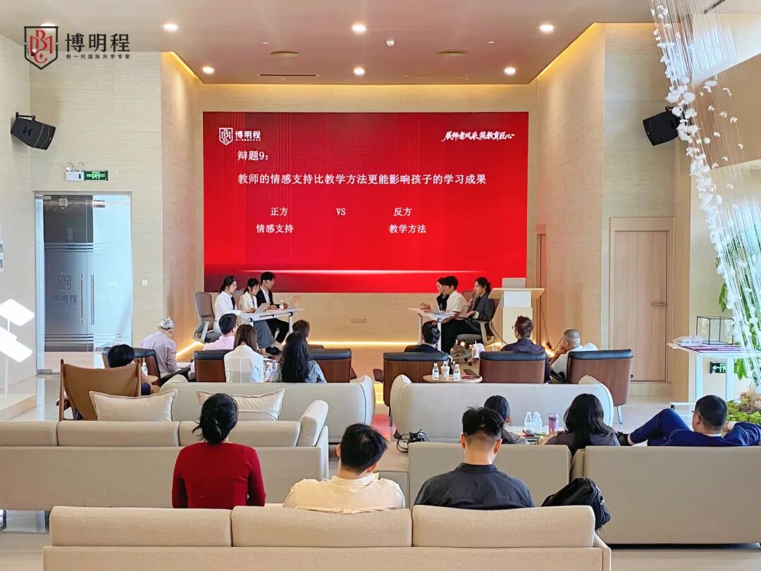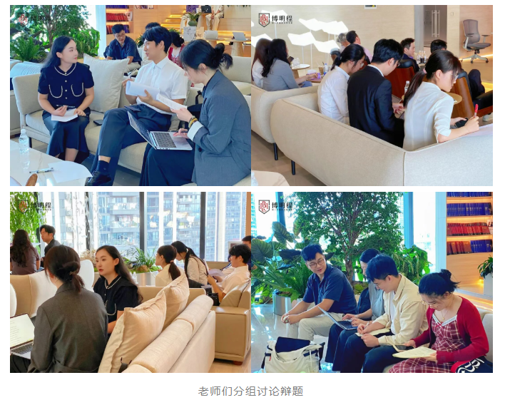 本次教师赛课总决赛的辩论环节共设四场对决。参赛老师们通过现场抽签,随机组队并抽取辩题,非常考验临场反应。而负责评判的,是由博明程集团6位高层领导以及各校区的学科主管、老师代表们累计20人组成的专业评委团,从论证说服力、反驳有效性、团队配合度、整体表现四个维度,为各队打分、点评,全面检验老师们的真功夫。