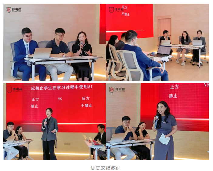 在最后一场辩论中,围绕当下时代的AI热点,正反双方老师探讨了“是否应禁止学生在学习过程中使用AI”这一辩题。正方老师立足教育本质与学生长远发展,力陈AI可能带来的四大隐忧:助长思维惰性、破坏学术诚信、答案质量参差、抹杀个体差异。
