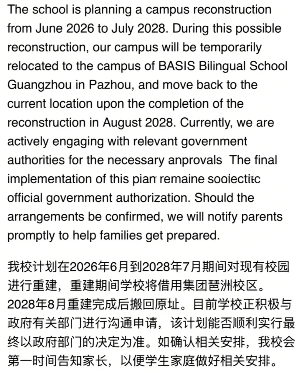 前两周刚开学,广贝黄埔校区就官宣计划在2026年6月至2028年7月对现有校园进行重建。在此期间,老校区学生将统一搬到琶洲新校区就读。而且,广贝现任校长Jason Shrobe明年也会调任琶洲校区担任创校校长。