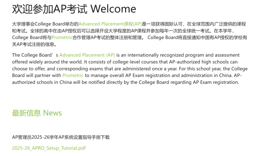 自2026年起,Prometric管理的国内AP考试在继续面向AP授权学校考生提供服务的同时,将增设社会考生报名通道。欢迎目前所在学校未开设AP课程,但有意挑战自我、参加AP考试的学生积极报考。