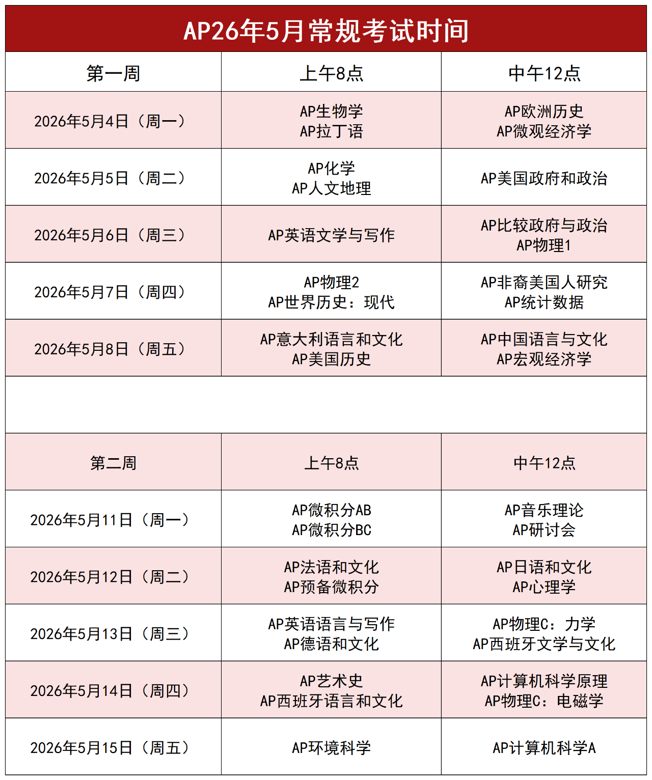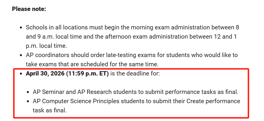 另外需要提醒参加AP Seminar、AP Research以及AP CSP的考生们,提交作品的截止日期为美东时间2026年4月30日23:59。