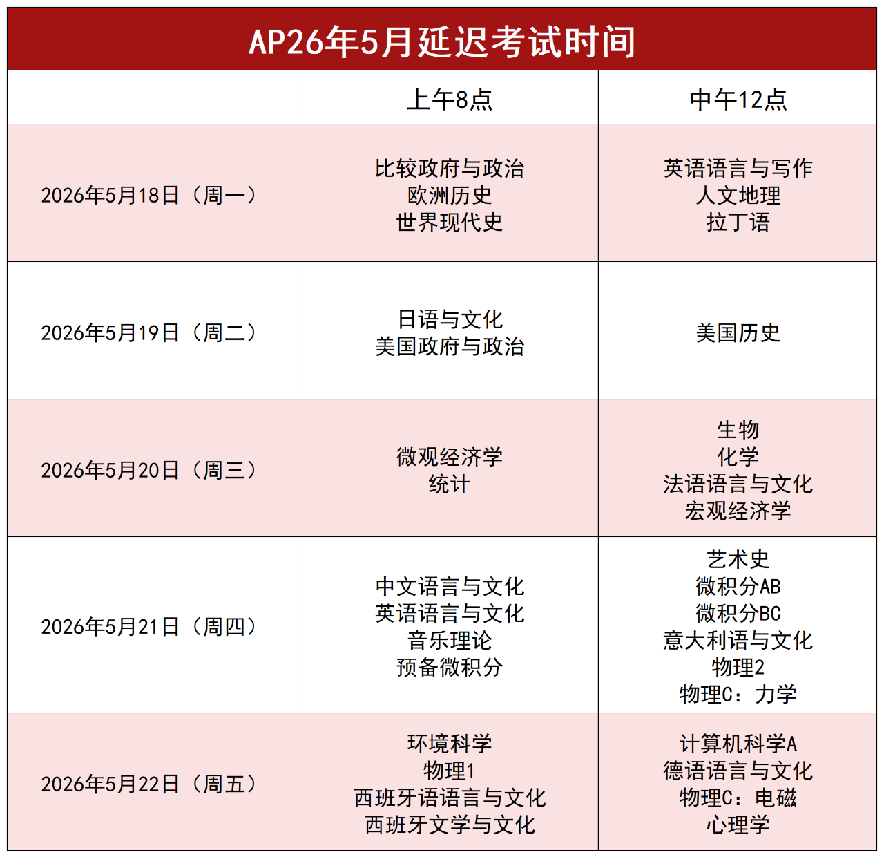 延迟考试时间:2026年5月18日-22日