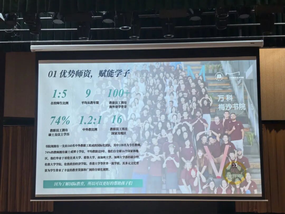 师资方面拥有一支由160名中外教职工组成的国际化团队,其中108名为专任教师,74%的教师拥有硕士或博士学位,平均教龄达9年,中外教比例1.2:1,在校师生比例1.5。