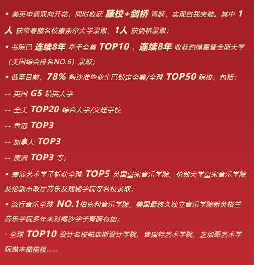 2025年海外升学季,梅沙学子也在大家的关注下持续传来好消息。截止4月2日24:00数据,梅沙学子共收获630封来自美、英、加、澳、港等国家及地区的顶尖名校录取(奖学金总额约人民币1950万元),藤校+剑桥,美英双开花!其中: