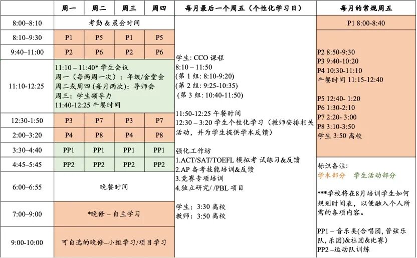 新时间表还设置了“SSR、HRT、CCO”等独立模块。例如,周一至周四的9:50–10:10为Y1–Y4学生的SSR时段,周五则安排“导师PSHE时间/学院时间”,方便学生在老师指导下自主安排阅读、学术探索或个人发展目标。