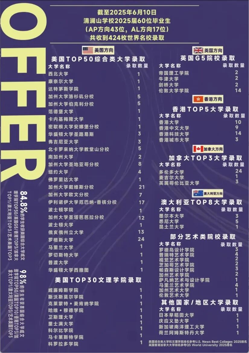截至2025年6月10日,清澜山2025届60位毕业生(AP方向43人、AL方向17人)共斩获424枚世界顶尖院校录取通知,核心数据如下: