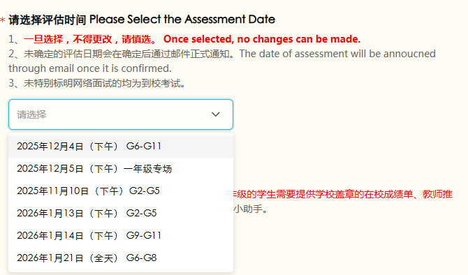 2.尚未确定的评估日期,学校将通过邮件形式正式通知,请确保邮箱畅通无阻。