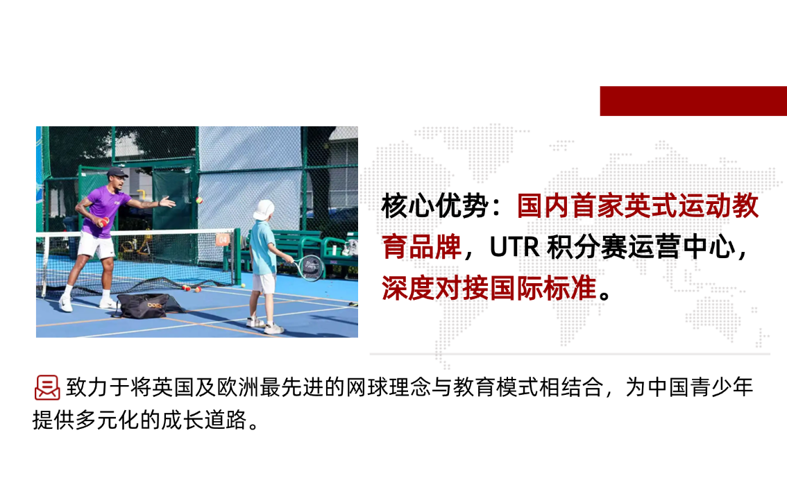 专项与升学:根据学员特点进行专项强化,冲击更高UTR排名,可作为特长申请海外高中或大学。
