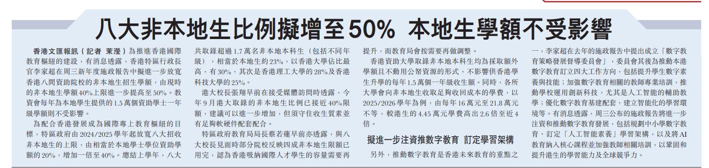 港大校长张翔近期透露,今年 9 月港大招收的非本地生已接近40%的限额。其他大学校长也纷纷向教育局局长蔡若莲反映,40%的额度已被用完。由此可见,提高招生上限的举措,正是基于当下实际招生需求而做出的及时调整。